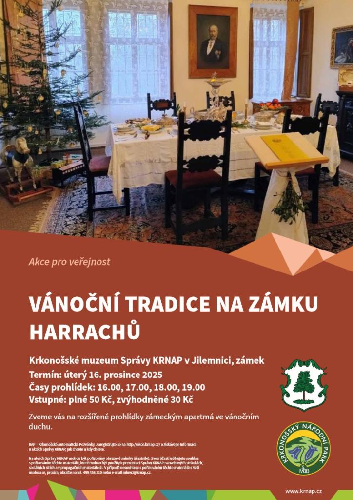 Zveme vás na akci Vánoční tradice, která se koná v úterý 16. prosince 2025 v Krkonošském muzeu Správy KRNAP v Jilemnici. Během této události budou probíhat rozšířené prohlídky zámeckého apartmá, které se ponese v vánočním duchu. Prohlídky začínají v 16.00, 17.00, 18.00 a 19.00. Vstupné činí 50 Kč pro dospělé a 30 Kč pro zvýhodněné vstupenky. Těšíme se na vaši účast a společné prožití vánoční atmosféry.